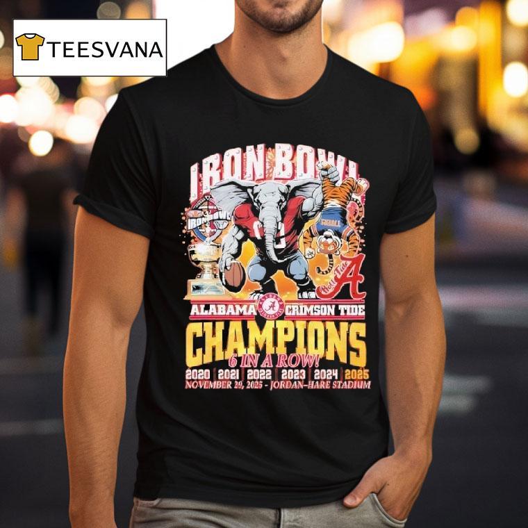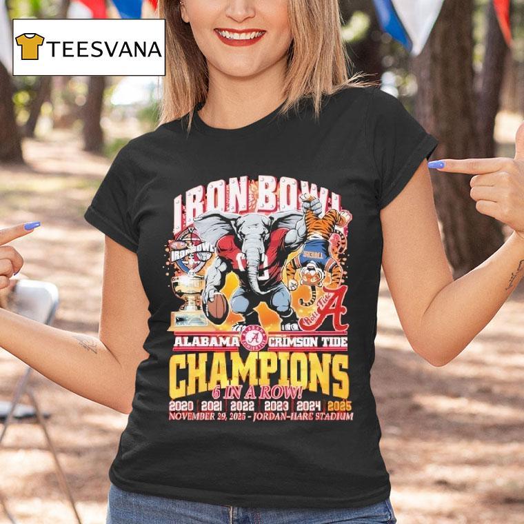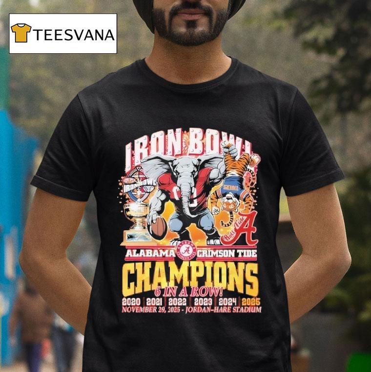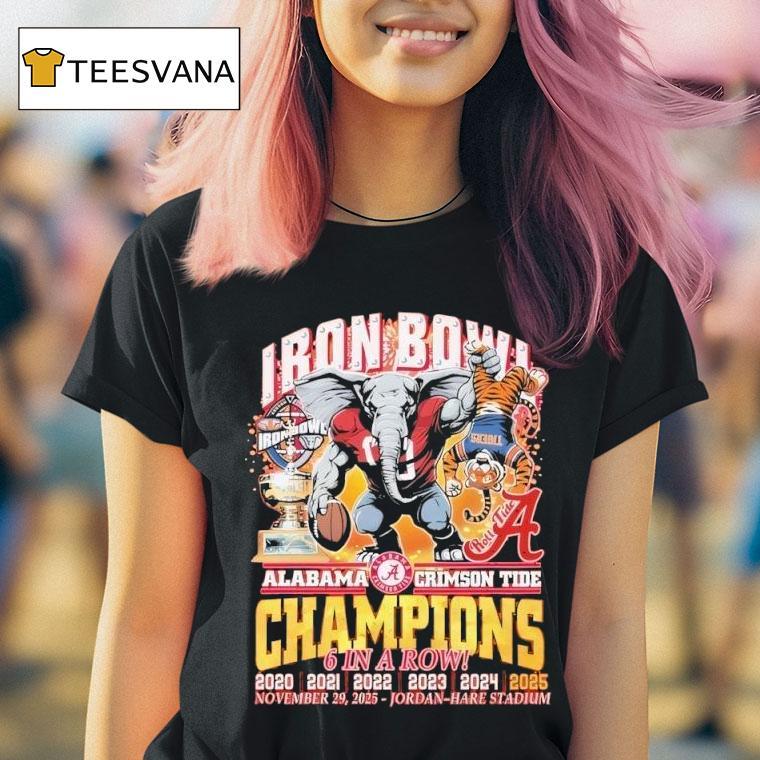 Classic charm, modern comfort with Alabama Crimson Tide Iron Bowl Champions 6 In A Row 2025 Shirt, get ready to show your pride as the Alabama Crimson Tide dominate the Iron Bowl for six consecutive years with the 2025 Championship! Celebrate this legendary winning streak with the official Alabama Crimson Tide Iron Bowl Champions 6 In A Row 2025 shirt.