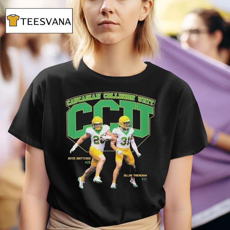 Simple sophistication, all day with Bryce Boettcher And Dillon Thieneman Caucasian Collision Unit Oregon Ducks Shirt, bryce Boettcher and Dillon Thieneman have formed a unique partnership as the Caucasian Collision Unit for the Oregon Ducks football team. These two defensive stars have dominated the field and now have their own custom t-shirts to celebrate their success on and off the field.