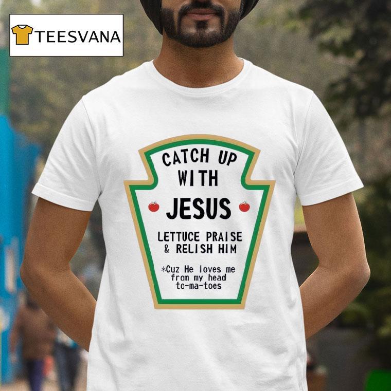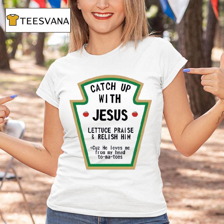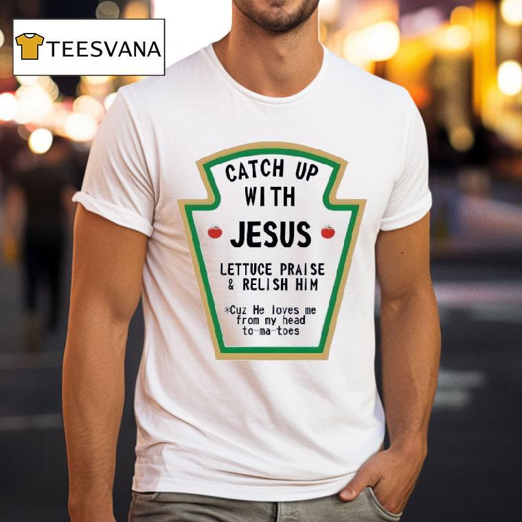 Casual chic, every day with Catch Up With Jesus Lettuce Praise And Relish Him Cuz He Loves Me From My Head Tomatoes Shirt, have you heard about the latest fashion trend? It’s all about catching up with Jesus while wearing your Lettuce Praise and Relish Him Cuz He Loves Me From My Head Tomatoes shirt. Join the movement and show off your love for Jesus in style!