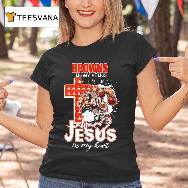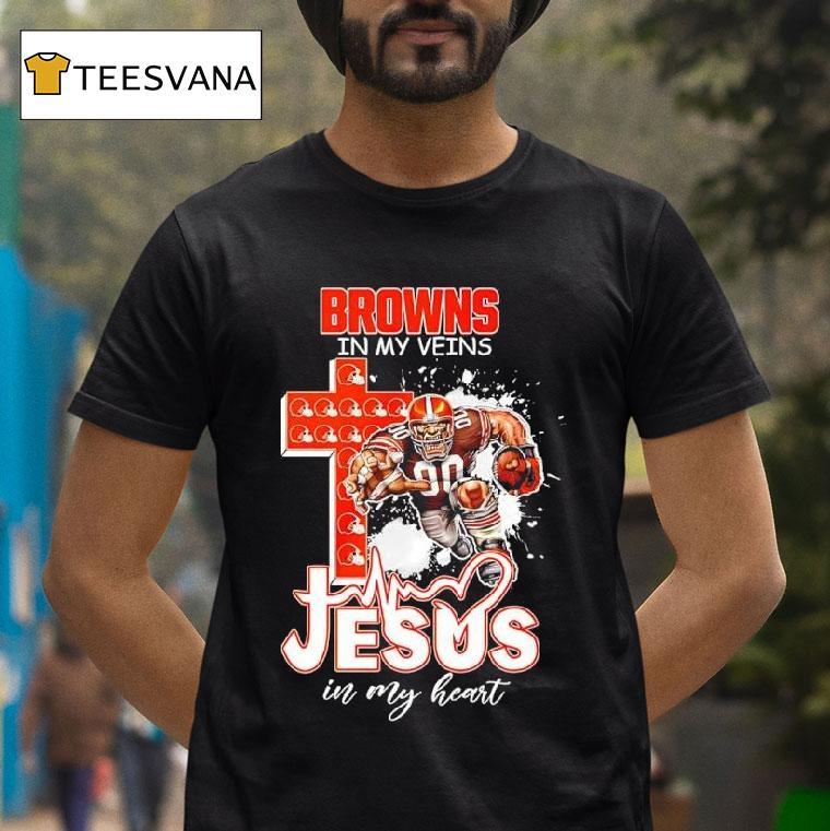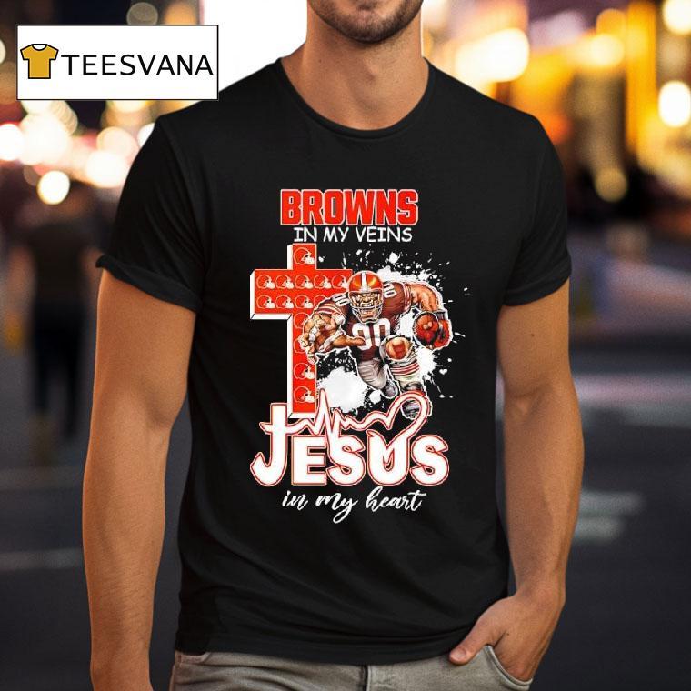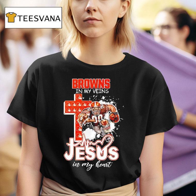 Simple style, big impact with Cleveland Browns In My Veins Jesus In My Heart Features A Football Player Logos Cross Shirt, as a die-hard Cleveland Browns fan, the team runs in my blood and ignites a passion in my heart. And now, with the “Jesus In My Heart, Features A Football Player” logos cross shirt, I can proudly showcase my love for both my team and my faith.