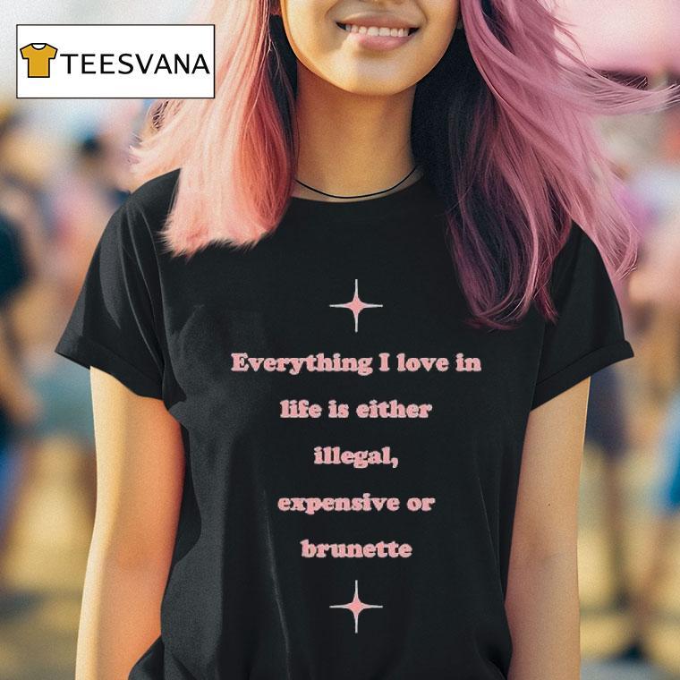 Versatile fashion, timeless appeal with Everything I Love In Life Is Either Illegal, Expensive Or Brunette Shirt, as I gaze at my “Everything I Love Is Illegal, Expensive, or Brunette” shirt, I can’t help but chuckle at the truth behind the statement. From my rebellious nature to my taste for the finer things and my preference for brunettes, this shirt truly sums up my passions in life.