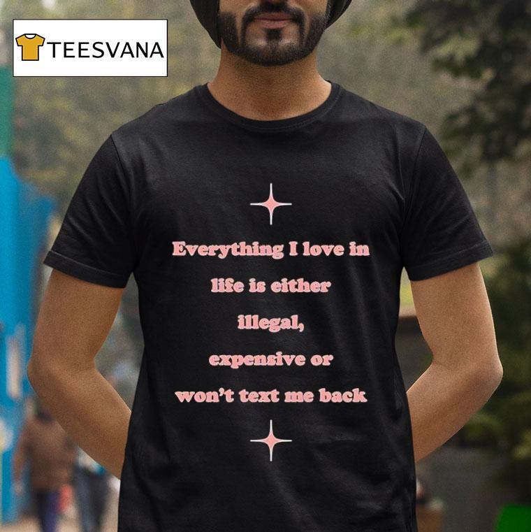Wardrobe essential, always chic with Everything I Love In Life Is Either Illegal Expensive Or Won’t Text Me Back Shirt, life can be full of challenges, but nothing encapsulates this truth quite like the phrase “Everything I love in life is either illegal, expensive, or won’t text me back.” This witty and relatable saying has become popular on a shirt, highlighting the struggles we face in pursuit of our desires.