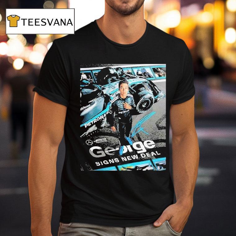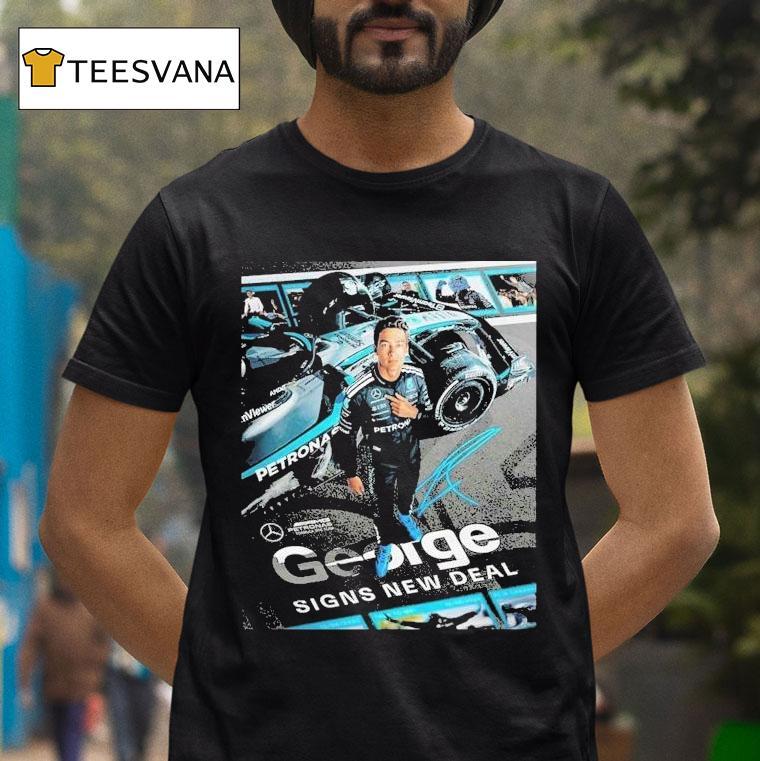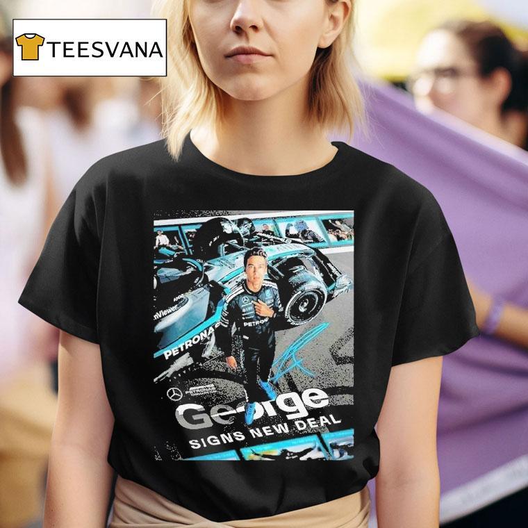 Comfort meets fashion with George Russell Of Mercedes Amg Petronas Formula One Team Signs New Deal 2025 Shirt, george Russell, the rising star of the Mercedes AMG Petronas Formula One Team, has recently signed a new deal that will keep him with the team until 2025. Along with his impressive driving skills, Russell’s name will now represent the team on their official shirt for the next four years.