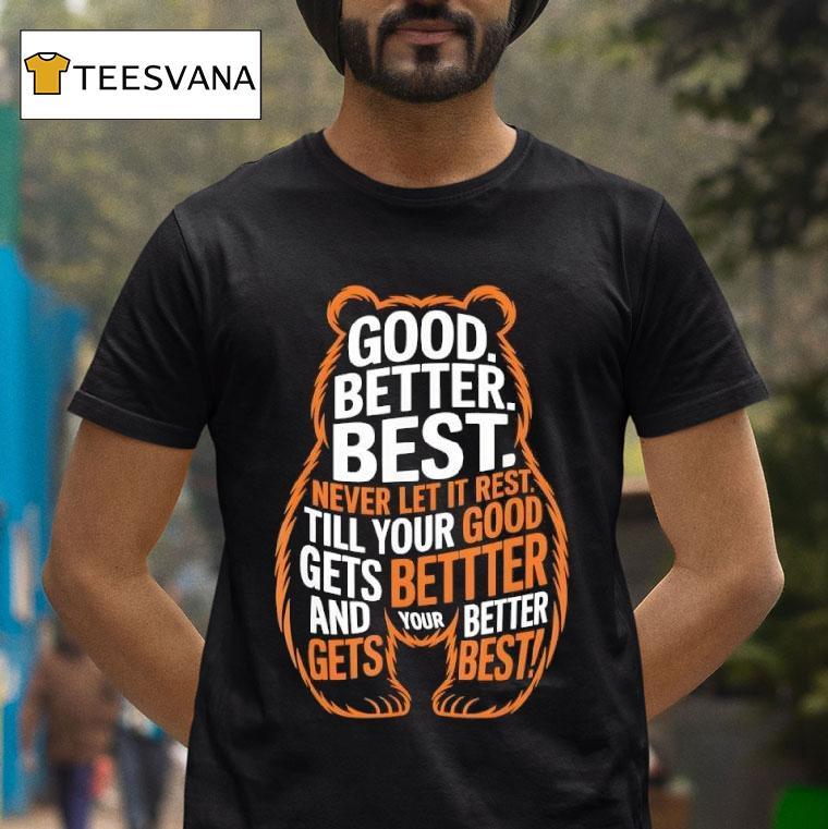 Staple piece, endless possibilities with Good Better Best Never Let It Rest Quote Motivation Bears Shirt, looking for some motivation to push you towards your goals? Look no further than the saying “Good, Better, Best. Never let it rest.” This powerful quote is now available on our new line of bears shirts, serving as a daily reminder to always strive for your best self.