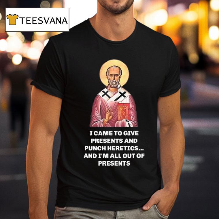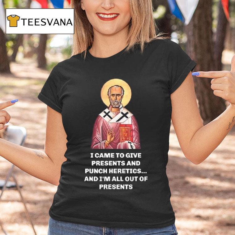 Your style, your way with I Came To Give Presents And Punch Heretics And I’m All Out Of Presents Shirt, “‘Tis the season of giving, but for some, it’s also a time to fight for what they believe in. With the festive “I Came To Give Presents And Punch Heretics And I’m All Out Of Presents” shirt, one can spread holiday cheer and defend their beliefs in one bold statement.”