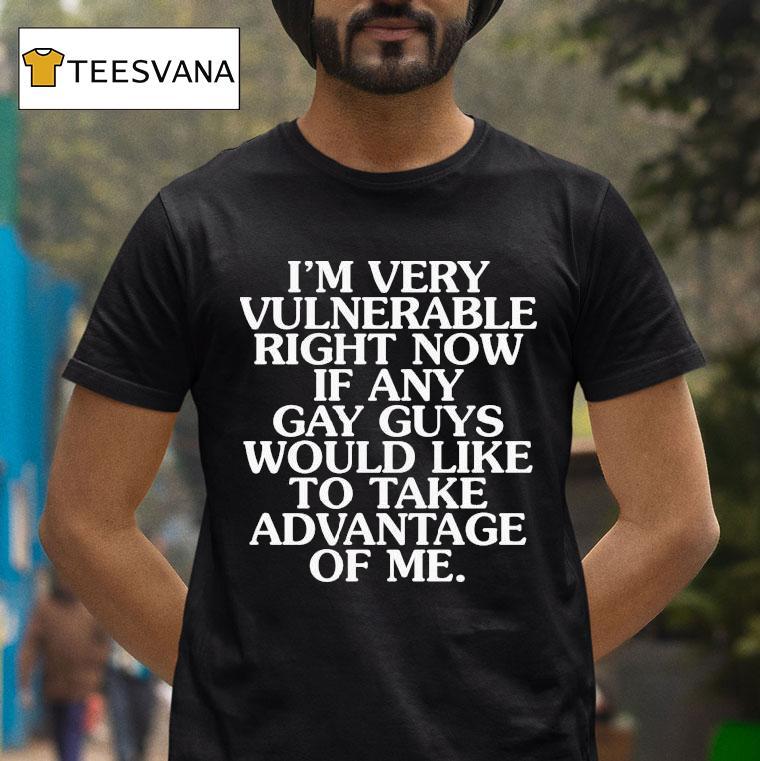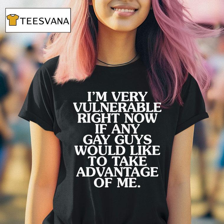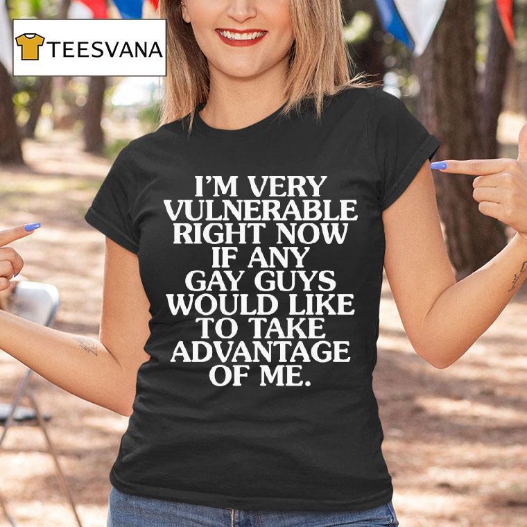 Casual luxury, anytime wear with I’m Very Vulnerable If Any Gay Guys Would Like To Take Advantage Of Me Shirt, as a straight man, I never thought I would be in a position to say this, but here it goes – I’m very vulnerable if any gay guys would like to take advantage of me. It may sound strange, but let me explain why.