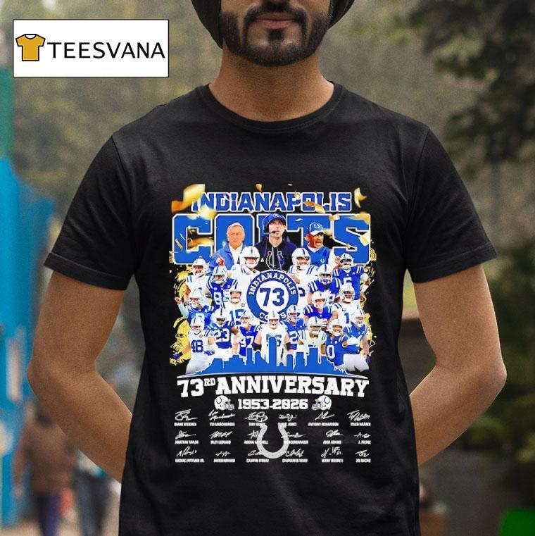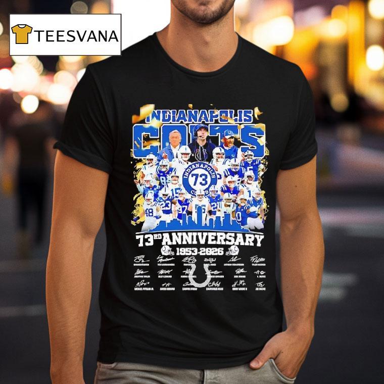 Chic comfort, all day with Indianapolis Colts 73rd Anniversary 1953 2026 Signatures Shirt, celebrate the rich history of the Indianapolis Colts with the limited edition 73rd Anniversary 1953-2026 Signatures shirt. Featuring the signatures of past and present players, this commemorative shirt is a must-have for any true fan. Get yours now and proudly display your love for the Colts.