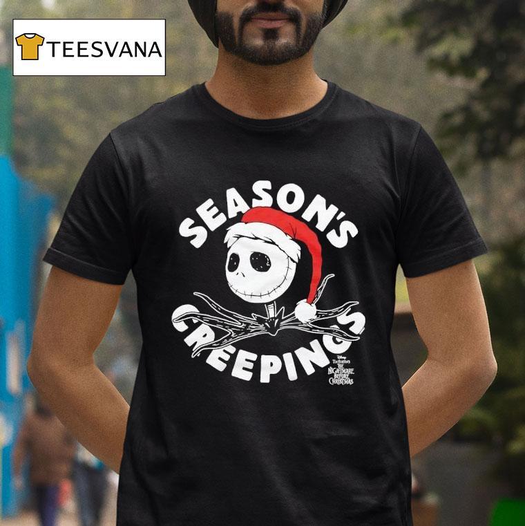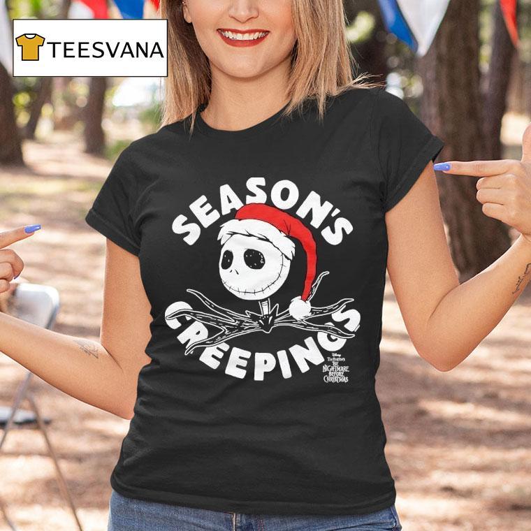 Your fashion canvas with Jack Skellington Wearing Santa Claus Before Christmas Season’s Creepings Shirt, with Halloween just around the corner, Jack Skellington is getting into the holiday spirit by trading in his usual skeleton attire for a jolly Santa Claus suit. The Pumpkin King is ready to spread some cheer in his new “Season’s Creepings” shirt before the Christmas season officially begins.