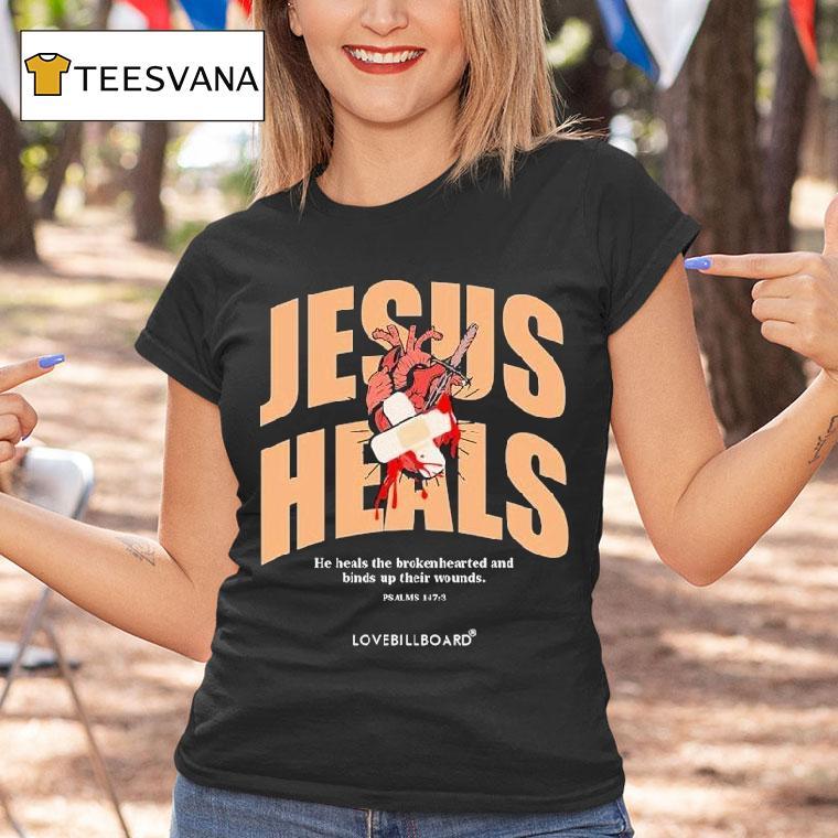 Casual chic, every day with Jesus Heals He Heals The Brokenhearted And Binds Up Their Wounds Lovebillboard Shirt, “Experience the miraculous power of love with our exclusive ‘Jesus Heals’ t-shirt. Inspired by the verse from Psalms 147:3, this shirt serves as a reminder that He heals the brokenhearted and binds up their wounds. Wear it proudly and spread the message of hope and healing to all.”