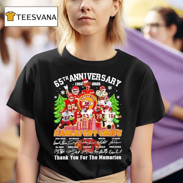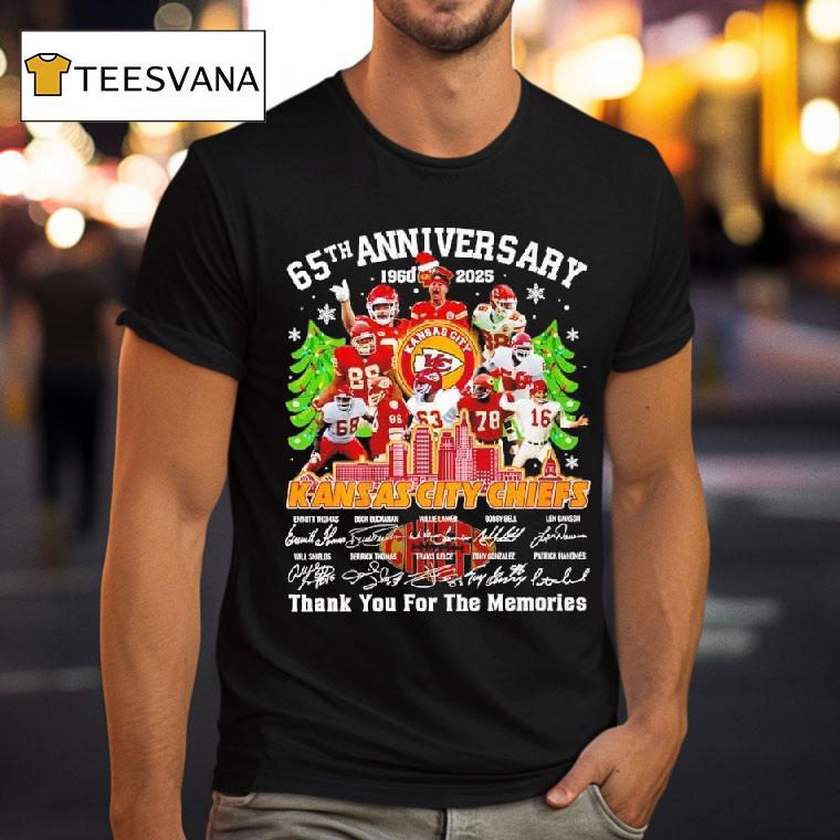 Everyday ease, endless style with Kansas City Chiefs 65th Anniversary 1960 To 2025 Signatures Christmas Trees And Snowflakes Shirt, celebrate the rich history and exciting future of the Kansas City Chiefs with their 65th Anniversary commemorative shirt featuring team signatures, Christmas trees, and snowflakes. Show your support and holiday spirit in style with this unique and festive design!