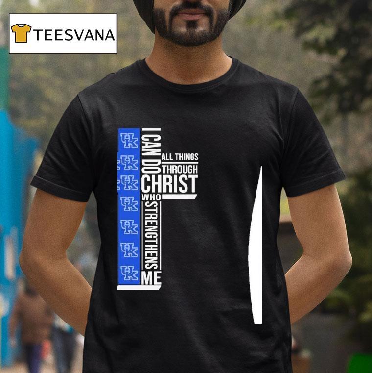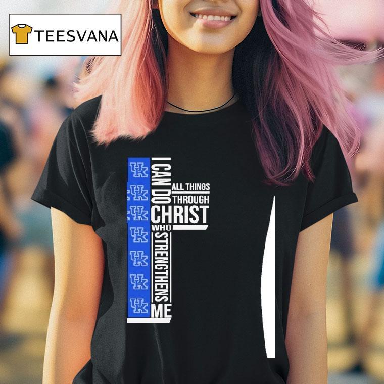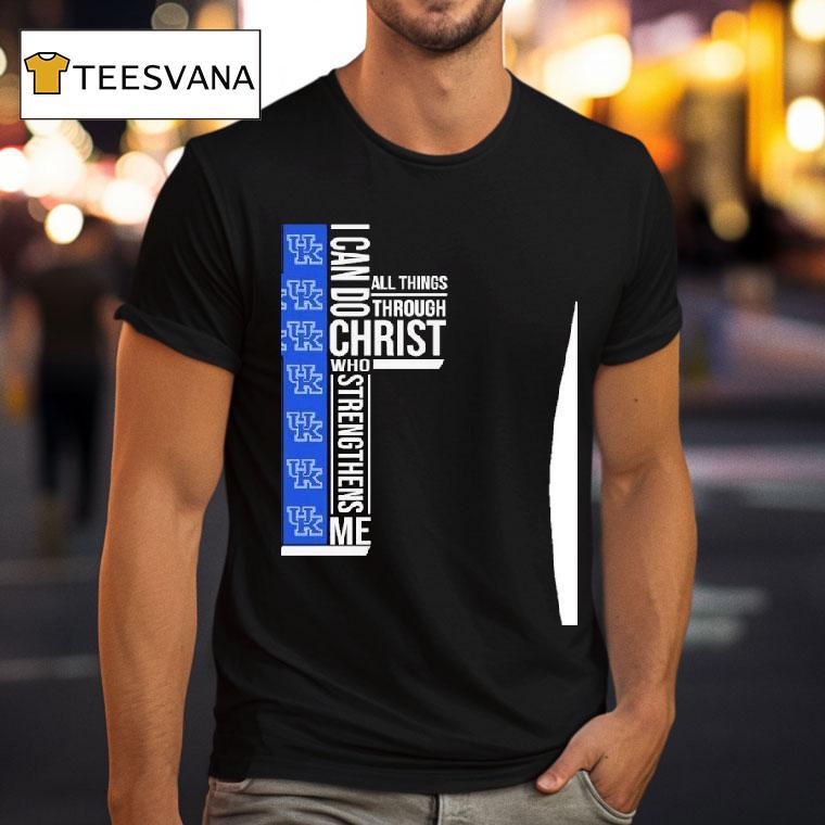 Casual cool, anytime chic with Kentucky Wildcats I Can Do All Things Through Christ Who Strengthiens Me Shirt, the roar of the crowd echoes through Rupp Arena as the Kentucky Wildcats take the court, adorned in their signature blue and white. But it’s not just their skill and determination that makes them stand out – it’s the powerful message emblazoned on their jerseys: “I Can Do All Things Through Christ Who Strengthens Me.”