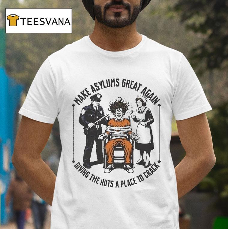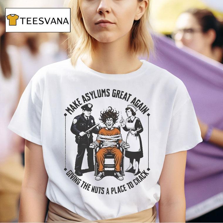 Casual chic, every day with Make Asylums Great Again Giving The Nuts A Place To Crack Shirt, welcome to the new era of mental health care, where we aim to Make Asylums Great Again by providing a safe and supportive environment for individuals to crack their nuts. Introducing the exclusive “Giving The Nuts A Place To Crack” shirt, wear it with pride and support a worthy cause.