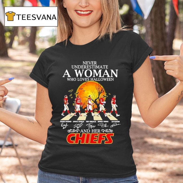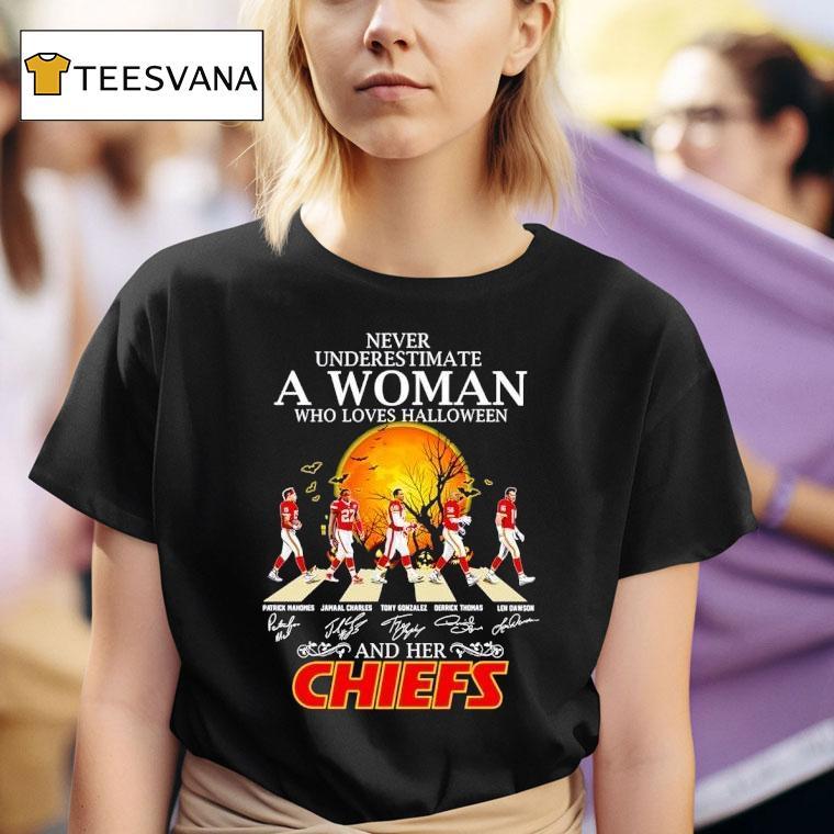 Wearable simplicity, unmatched comfort with Never Underestimate A Woman Who Loves Fall And Her Kansas City Chiefs Walking Across Halloween Shirt, as the leaves change and the cool breeze of fall rolls in, one can’t help but admire the fierce loyalty of a woman who loves the season and her beloved Kansas City Chiefs. And with her strut in a Halloween shirt, she’s undeniable – never underestimate her passion.