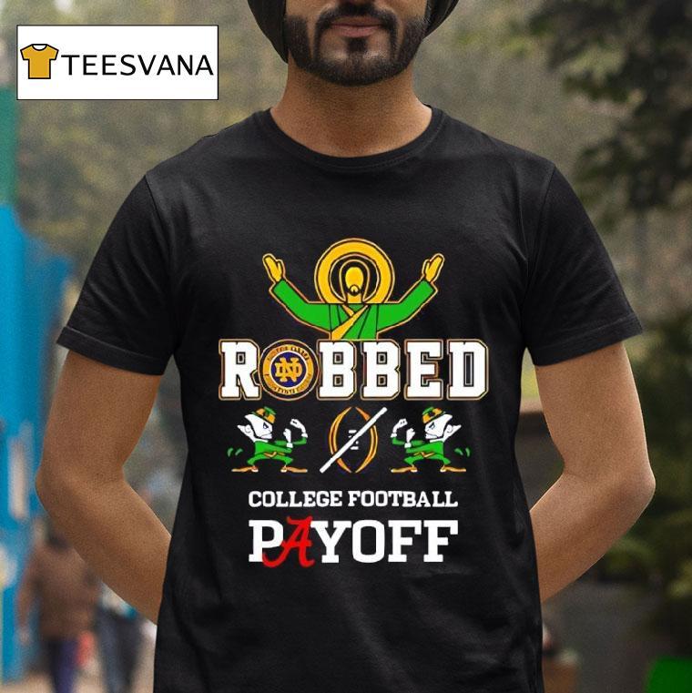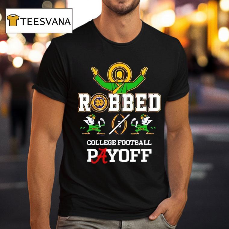Classic tee, modern twist with Notre Dame Fighting Irish Jesus Robbed College Football Playoff Shirt, “Get ready to show your team spirit in a unique way with the Notre Dame Fighting Irish Jesus Robbed College Football Playoff Shirt. This one-of-a-kind shirt combines two iconic symbols, showcasing your love for both the Fighting Irish and the man above. Don’t miss out on this must-have for any Notre Dame fan!”