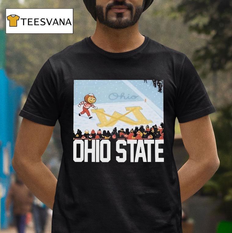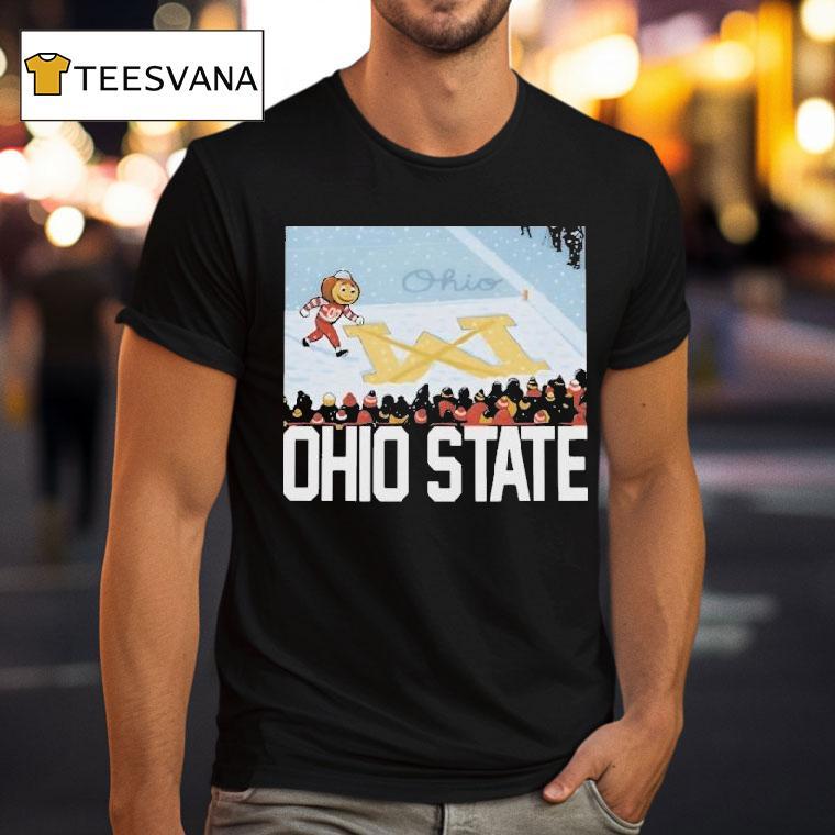 Uncomplicated style choice with Ohio State Buckeyes Vs Michigan Wolverines Rivalry Script Ohio On Big M Brutus Mascot Stadium Shirt, the Ohio State Buckeyes and Michigan Wolverines have one of the most intense and historic rivalries in college football. As the two teams face off once again, fans can show their support with the iconic Big M Brutus mascot stadium shirt, representing the pride and tradition of both schools.