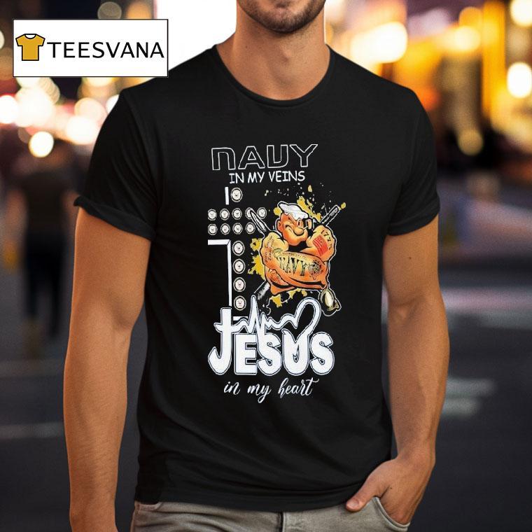 The perfect blank canvas with Popeye U.s. Navy In My Veins Jesus In My Heart Shirt, step aboard the USS Popeye and you’ll find sailors with more than just ink in their veins. For these brave men and women, serving in the U.S. Navy is not just a job, it’s a way of life. And with Jesus in their hearts, they face every mission with courage and strength. But one thing is for certain, the iconic Popeye U.S. Navy In My Veins Jesus In My Heart Shirt is more than just a piece of clothing, it’s a symbol of honor, sacrifice, and unwavering faith.