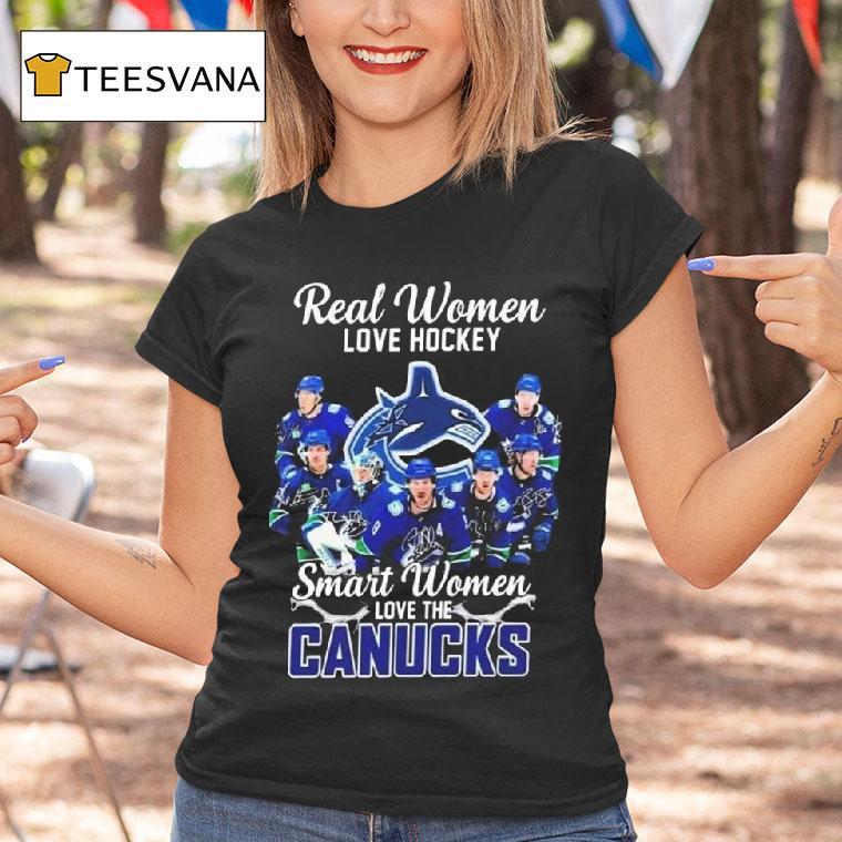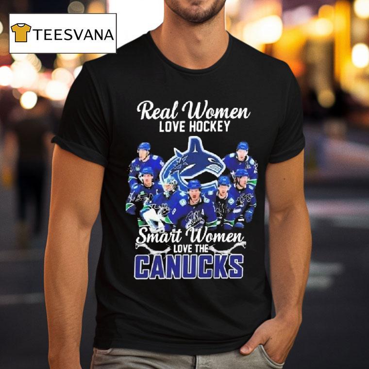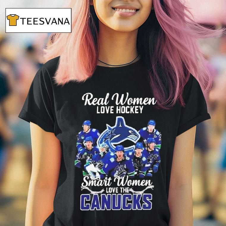 Casual cool, anytime chic with Real Women Love Hockey Smart Women Love The Vancouver Canucks 2023 Signatures Shirt, calling all real women and smart hockey fans! It’s time to show your love for the Vancouver Canucks with the highly coveted 2023 Signatures Shirt. As true supporters of the game, let’s proudly display our passion for the Canucks and all that they represent. Let’s go, team!