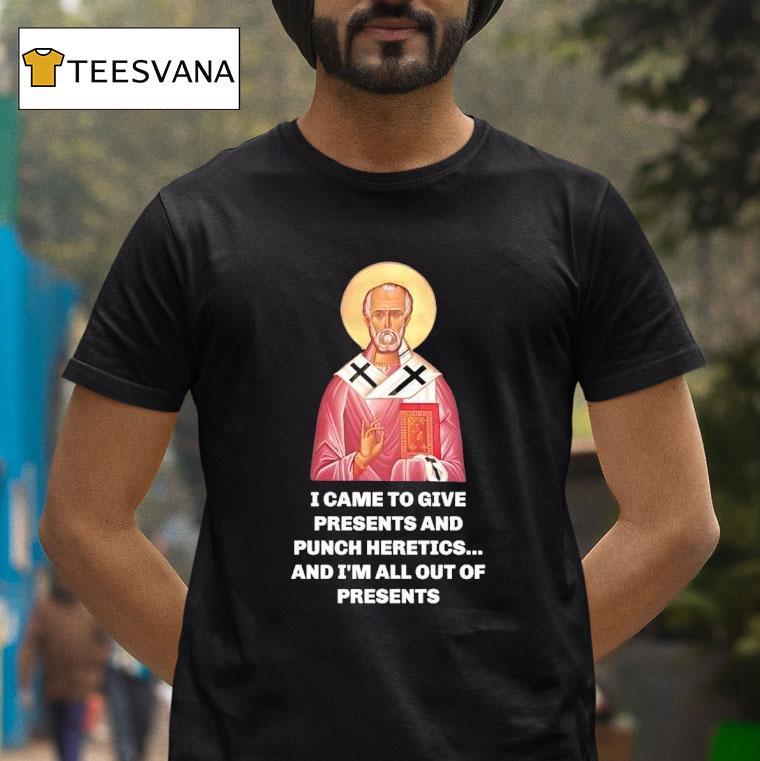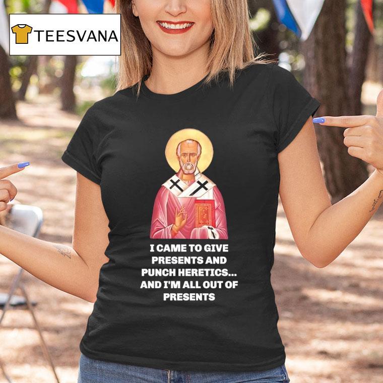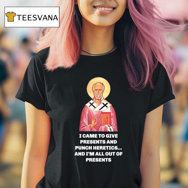 Timeless appeal, everyday wear with Saint Nicholas I Came To Give Presents And Punch Heretics And I’m All Out Of Presents Shirt, ho ho ho! Santa Claus might spread joy and gifts, but Saint Nicholas came to give presents and punch heretics. This epic Christmas shirt is perfect for anyone looking to keep the holiday spirit alive with a little humor and history.