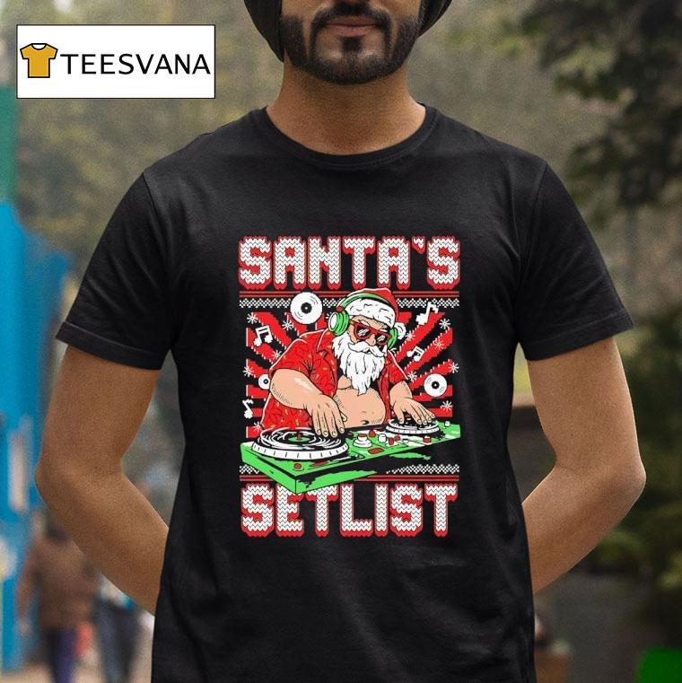 Instant style upgrade with Santa Claus Dj Santa’s Setlist Christmas Shirt, get ready to rock around the Christmas tree with the hottest holiday DJ in town – Santa Claus! He’s got a killer setlist and is sporting his new Christmas shirt. Get into the festive spirit and dance the night away with DJ Santa.