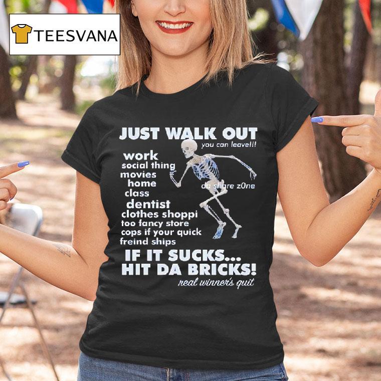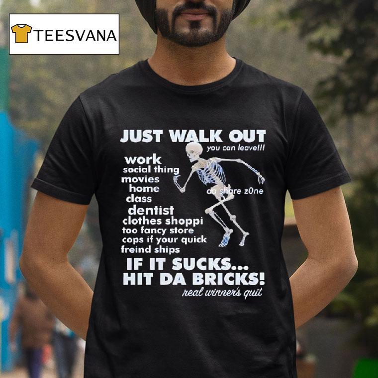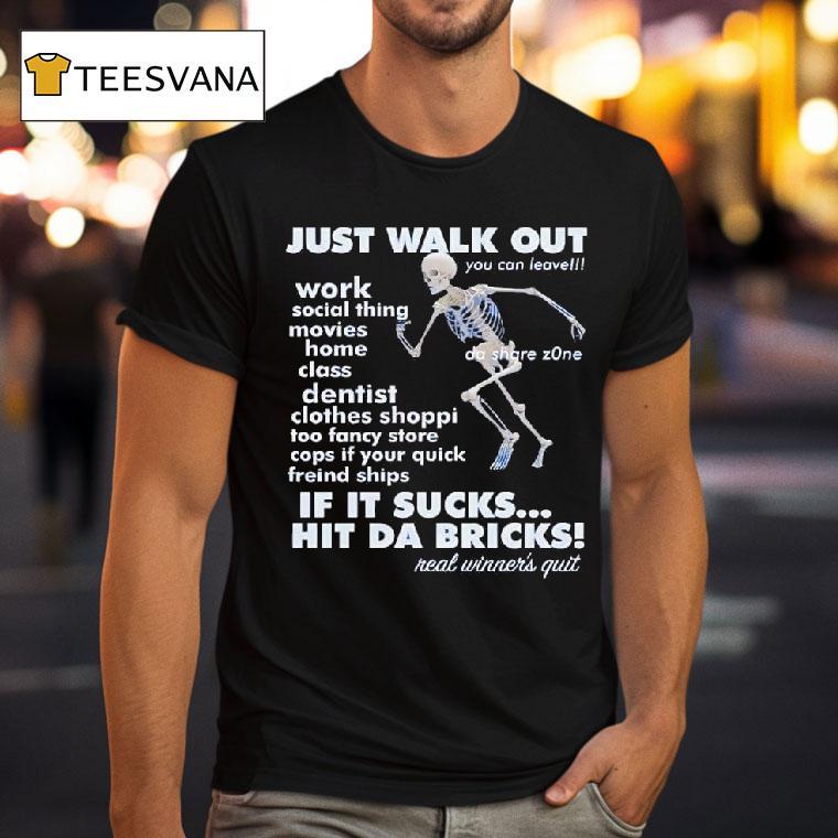 Classic charm, modern edge with Skeleton Just Walk Out If It Sucks Hit Da Bricks Shirt, are you tired of wearing boring, basic t-shirts? Look no further than the Skeleton Just Walk Out If It Sucks Hit Da Bricks Shirt! With a spooky yet cool design, you’ll be sure to turn heads and express your unique style. Get yours today and stand out from the crowd.