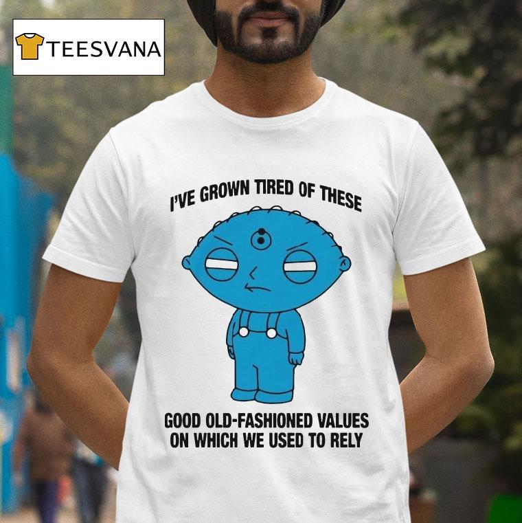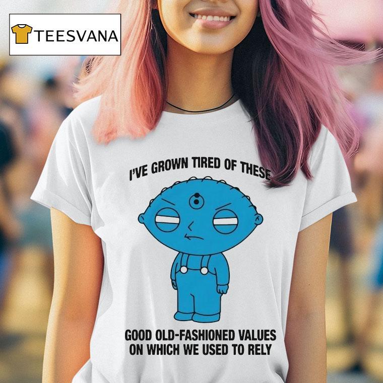 Chic comfort, everyday fashion with Stewie Griffin I’ve Grown Tired Of These Good Old-fashioned Values On Which We Used To Rely Shirt, stewie Griffin from Family Guy is known for his mischievous and sarcastic nature, but one thing he’s not joking about is his disdain for traditional values. From his famous line, “I’ve grown tired of these good old-fashioned values on which we used to rely,” to his bold fashion statement with a shirt bearing the same sentiment, Stewie continues to challenge societal norms in his own unique way.
