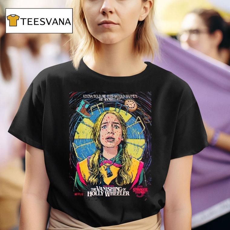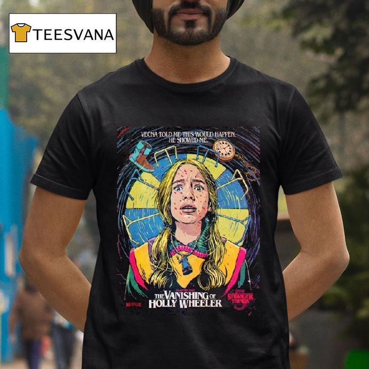 Casual chic, timeless appeal with Stranger Things 5 Chapter Two The Vanishing Of Holly Wheeler Butcher Billy Vecna Told Me This Would Happen Shirt, welcome to the next chapter of Stranger Things 5, where the mystery of the vanishing of Holly Wheeler deepens. Butcher Billy and Vecna continue their wicked plans, as told by an ominous shirt. Brace yourselves for more spine-chilling twists and turns in the thrilling world of Stranger Things.