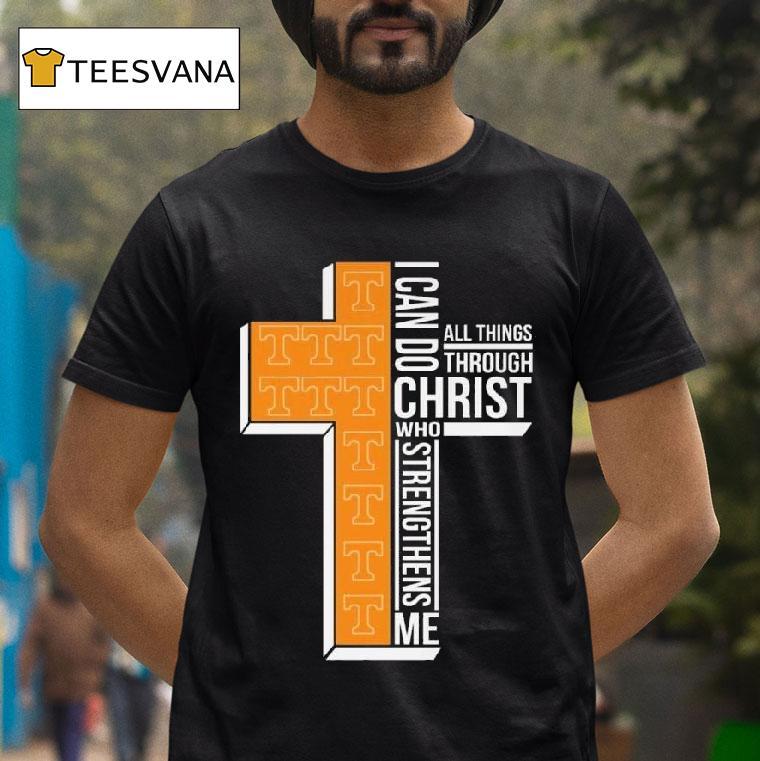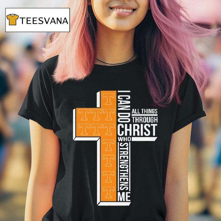 Classic charm, modern edge with Tennessee Volunrs I Can Do All Things Through Christ Who Strengthens Me Cross Shirt, “Show your Tennessee Volunrs pride with this inspiring shirt featuring the iconic cross. With the powerful reminder that “I can do all things through Christ who strengthens me,” this shirt is not only a symbol of faith but also of determination. Wear it with pride and let your spirit shine.”
