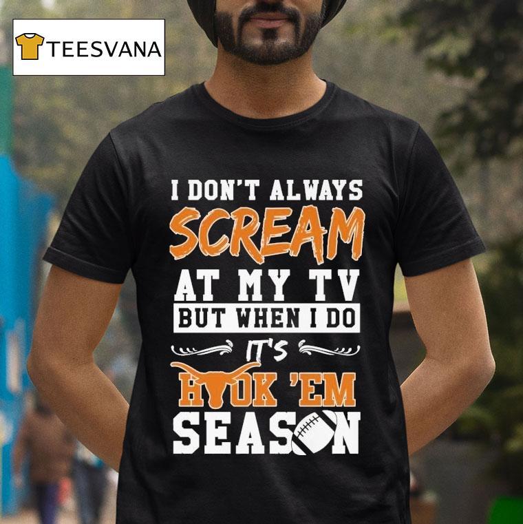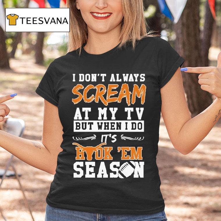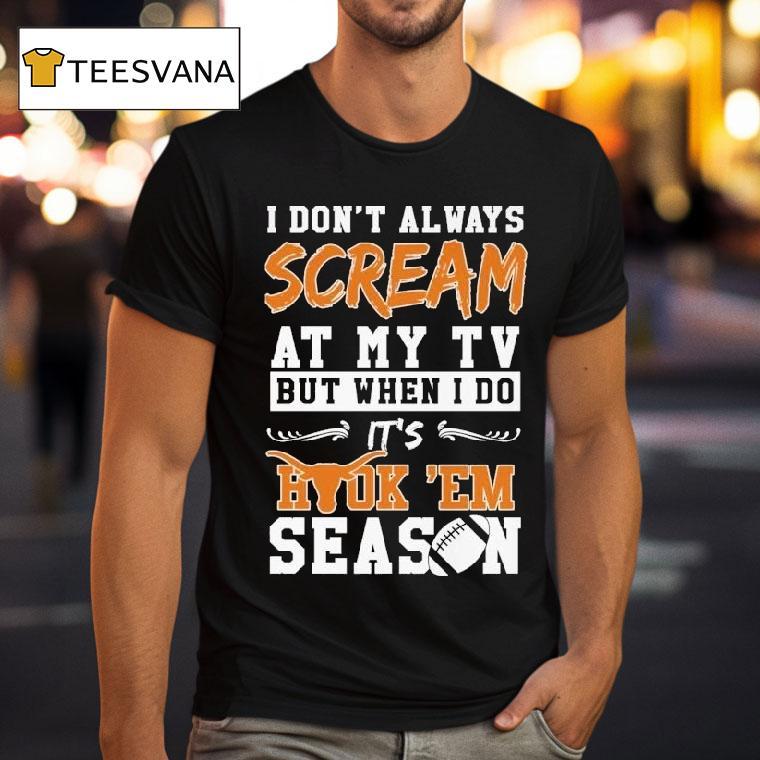 Chic comfort, all day with Texas Longhorns I Don’t Always Scream At My Tv But When I Do It’s Hook ‘em Season Shirt, get ready for some high-stakes football action because the Texas Longhorns are back on the field! And if you’re a die-hard fan, you know that this calls for some intense cheering, especially while wearing the “I Don’t Always Scream At My TV But When I Do It’s Hook ’em Season” shirt.