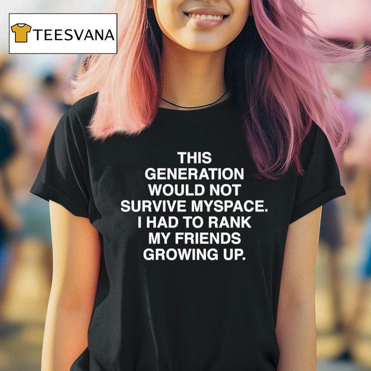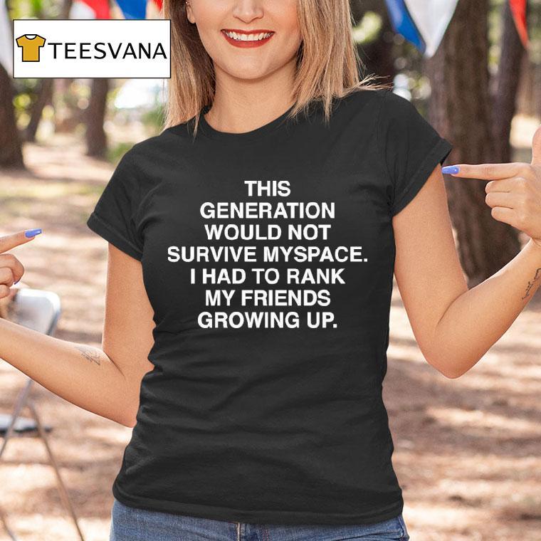Dress it up, dress it down with This Generation Would Not Survived Myspace I Had To Rank My Friends Growing Up Shirt, growing up in the era of Myspace, ranking friends on your top 8 was a serious business. But with today’s generation, it’s hard to imagine them surviving the drama and pressure that came with this social media platform. Now, it’s all about wearing the nostalgic “Myspace ranked friends” shirt.