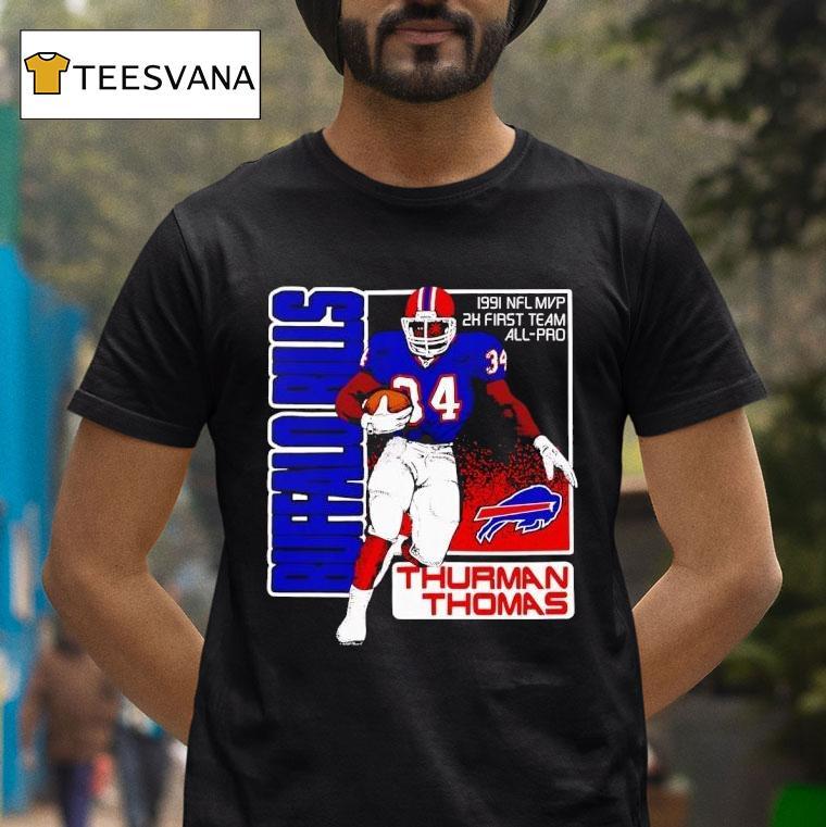 Timeless appeal, everyday wear with Thurman Thomas Buffalo Bills Nfl Mvp 1991 Shirt, the Buffalo Bills have had many iconic players throughout their history, but few have left a lasting legacy like Thurman Thomas. The NFL MVP of 1991, Thomas cemented himself as one of the greatest to don the Bills’ iconic blue and red, forever immortalized on the team’s commemorative shirt.