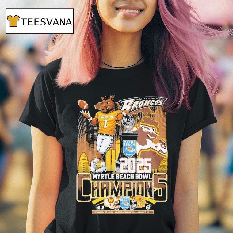 Classic tee, endless possibilities with Western Michigan Broncos 2025 Myrtle Beach Bowl Champions Mascot Shirt, get ready, Broncos fans! The Western Michigan Broncos have claimed victory as the 2025 Myrtle Beach Bowl Champions and it’s time to celebrate! Show off your team pride with the exclusive mascot shirt, a must-have for all dedicated fans. Get yours now and join in the celebration!