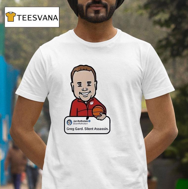 Classic tee, modern twist with Wisconsin Badgers Gred Gard Silent Assassin Caricature Shirt, get ready to show off your love for the Wisconsin Badgers with the new Gred Gard Silent Assassin Caricature Shirt. Designed with the fierce Badgers logo and caricature of Coach Gred Gard, this shirt is the perfect way to support your favorite team in style.